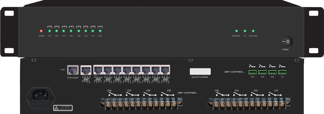 支持100M以太网TCP/UDP/TTL控制,7路RS232/RS485控制,1路红外控制(加扩展盒可将扩展8路),4路短路信号输出控制,8路电源控制。